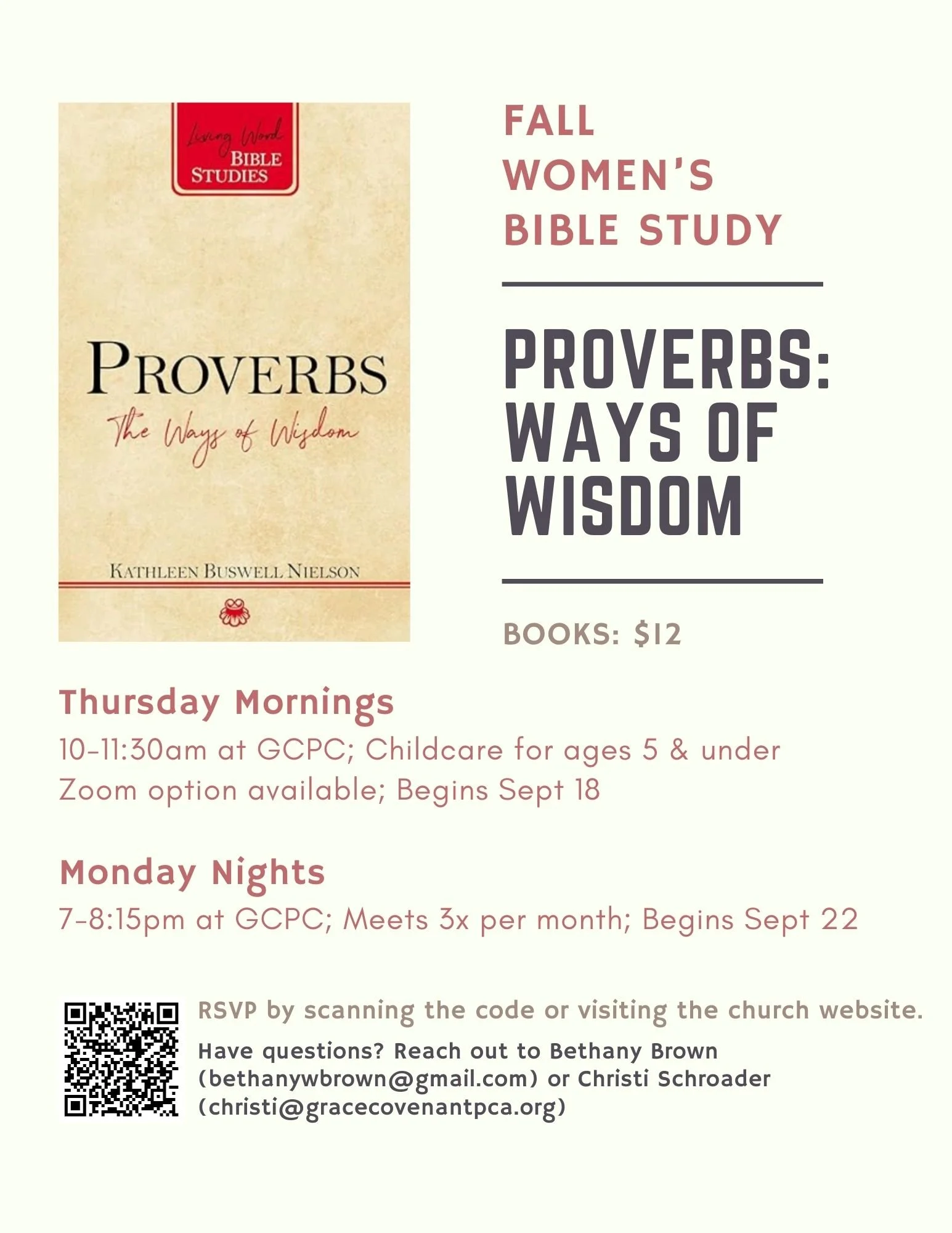 Fall Women’s Study: Proverbs- The Ways of Wisdom by Kathleen Nielson. Beginning Sept 18 (10-11:30am) or 22nd (7-8:15pm). Childcare is provided for the morning session.